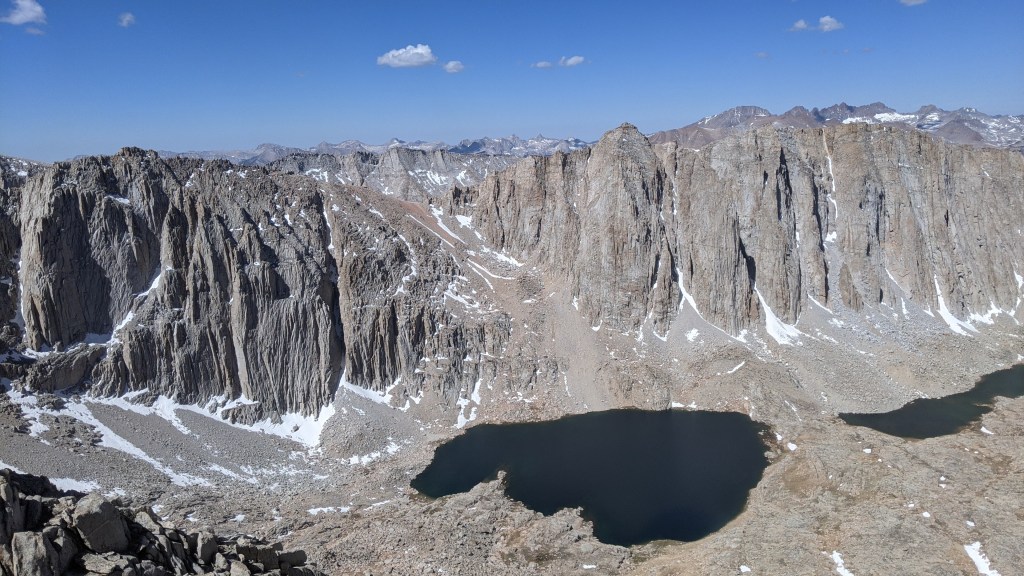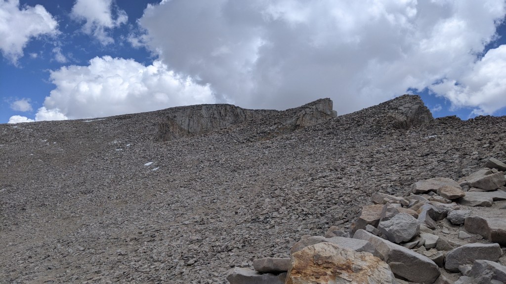 It was summit morning! I’d asked my mom vis my satellite messenger to send the weather report. She said it looked good, with only a 10% chance of rain, and not until after 2. I hoped that was true. I decided that I’d turn around at the first crack of thunder, as the last place I wanted to be in a lighting storm was the highest place in the state. We were up by 5 and hiking by 6. At 7 we got to the Crabtree area where we left our bear cans in a bear locker to reduce the weight of our packs. We were at Guitar Lake by 8:30 and I felt confident in my ability to make it up by 11.
