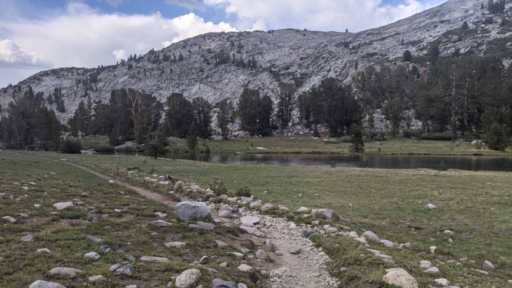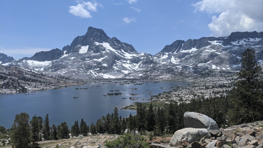 After taking a few zeros to recover from my covid vaccine reactions in Mammoth Lakes I headed back on trail. It was an easy day winding through Red’s Meadow to Devil’s Postpile National Monument. It was a hot day, but due to a recent reopening of the road to the monument the trails were packed with dayhikers. The views were nice, but familiar as I’d done a backpacking trip in this section the previous July. I made camp with Pez and Baby Bigfoot a mile or so above the Agnew Meadows trailhead.