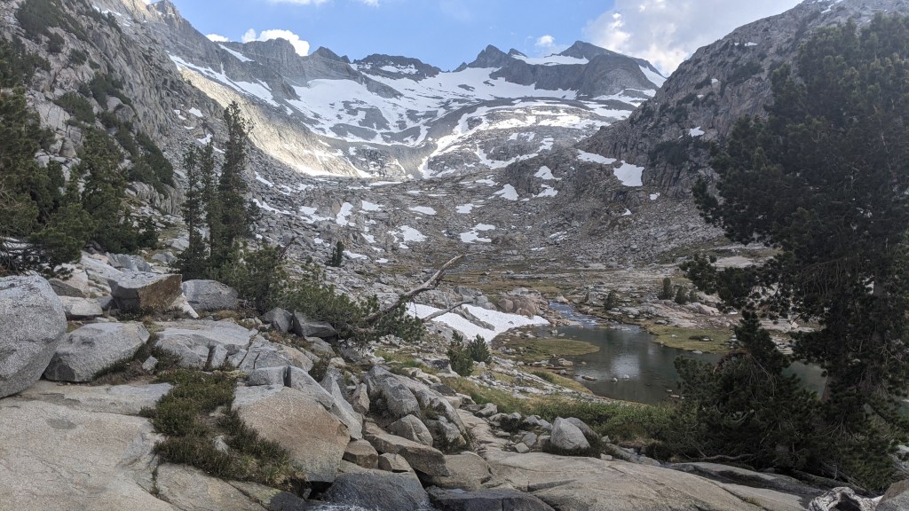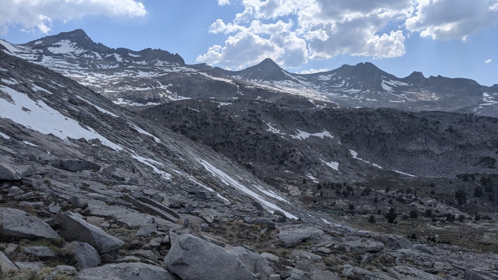This side of the pass had more snow than I’d thought, and the lake outlets were some of the most difficult crossings I’d had to date. I fell in twice. The first time my back foot slipped into knee high water. Great. Now I had to hike in wet shoes and socks. At the second crossing I’d lost the trail and was downstream of the intended crossing. I thought I could make my own way, but quickly realized that was a mistake as a rock moved and I fell in up to my mid thigh. At least I was at the edge of the river, so I could quickly get back to the bank. I’d scraped up my shin on my fall and now both feet were soaked. I cut my losses and headed back upstream to find the intended crossing.