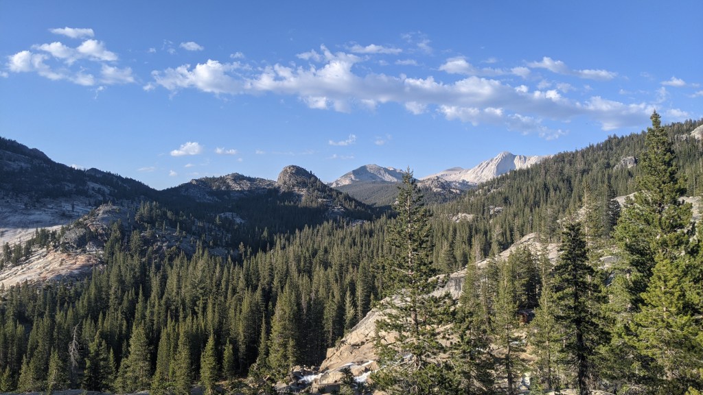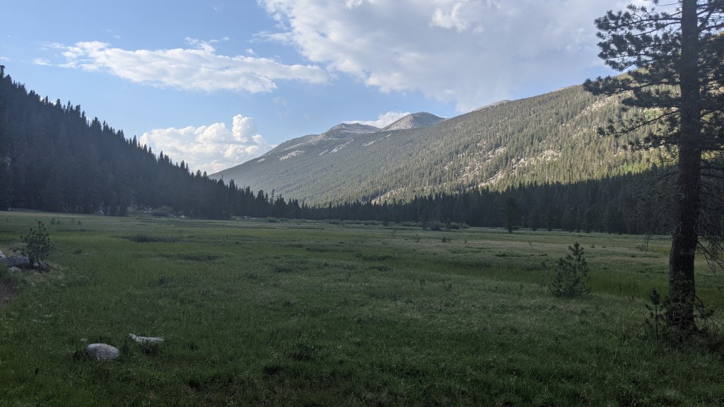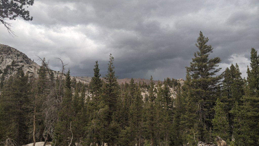I climbed the last few miles to Dorothea Pass, the northern exit of Yosemite, easily in the morning. The scenery was stunning, and I stopped to admire it even though mosquitoes would swarm every time I took a break longer than about 10 seconds. After exiting the park the trail descends through a forested area. I could see dark clouds gathering and worried about thunderstorms. These clouds were more numerous that the ones I’d seen in previous days, and they seemed to be right where I was headed.