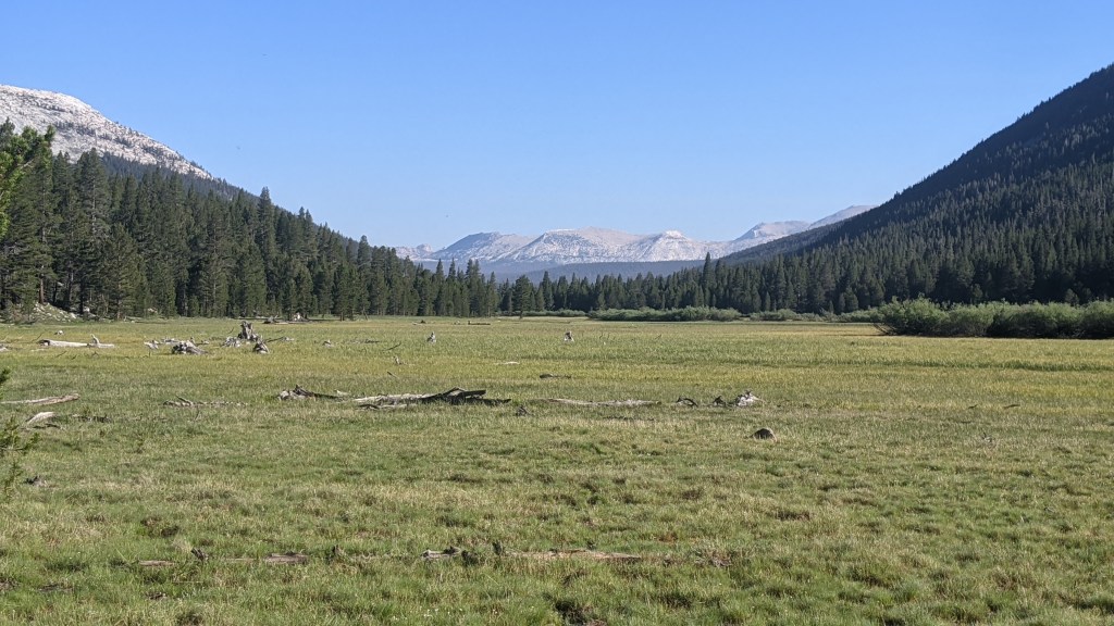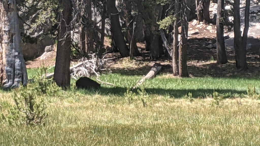 It was a flat, easy 9 miles or so to Toulumne Meadows, where Baby Bigfoot’s friends would meet us. I had never been to this side of the park before, so I admired the higher elevation meadows and new scenery. Less and a mile from Tuolumne Meadows a ranger approached me on trail. I assumed he’d come to ask for my permit, but instead he warned me that there was a bear and a cub ahead, and urged me to take a road to give them space.