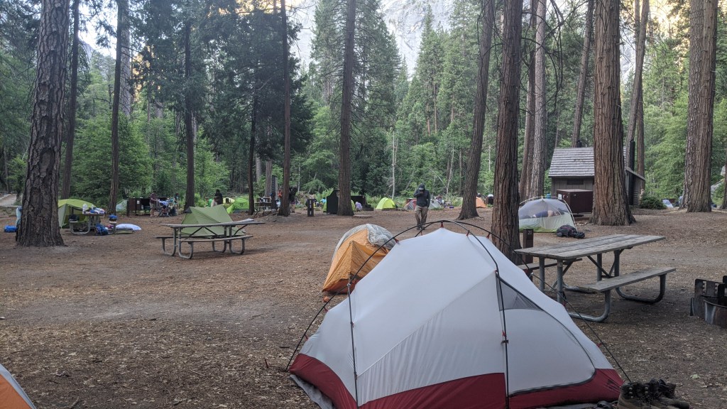 We spent too long enjoying pizza and beer. By the time we walked towards the rumored backpacker campground over a mile away the sun was setting and we were losing light fast. There was a large group of us who had nowhere to go if the backpacker’s camp fell through, so we hoped for the best in the fading light. When we got there it was clear that the backpacker’s campground was just the park’s way of segregating chaos. Officially, there was space for 16 tents. In actuality there were maybe 50 tents crammed on every available flat surface. We found whatever spot we could by the light of our headlamps and made camp. I set up my tent in a cloud of marijuana smoke from nearby campers. I didn’t see a ranger there at all all evening, except for late at night when a truck pulled up to drop off more hikers. I thought they’d check permits, but they didn’t. The camp appears to be the closest thing to a homeless encampment in the park. It’s a place to keep people who have no other options out of sight from the rest of the park. PCT hikers discovered illegally “stealth camping” in other parts of the park were dumped here as well. Overall, it was an experience I’m glad I had. And hey, camping in Yosemite Valley for $6 is a steal.