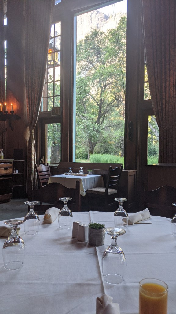 Smiles, Moon Man, Keebler, and many other hikers from the camp had Half Dome permits and were planning on heading up that morning. Pez and I had already done Half Dome, so we decided to spend a relaxed day exploring the valley. Baby Bigfoot and her parents invited us to breakfast as the Ahwahnee Hotel, so we headed over. We got there long before they did and put in a request for a table for 5. The hotel is the nicest in Yosemite, and I was very aware of how dirty and out of place I was. I almost worried that I might get asked to leave, but the hostess was so kind to Pez and I. She offered to let us store our packs in the coatroom and even snuck us the wifi password despite the fact that we weren’t staying there.
