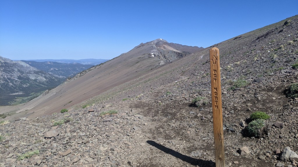 I passed a junction on the map but never saw it in reality. I saw a trail far below me, but I couldn’t believe it was the PCT. I’d followed all the signs. I checked for cell service and was surprised to see I had a little. I sent a text to Pez asking if he knew where to go. He said he’d also gotten lost and took the “Pony Express” trail to the highway instead. I wasn’t sure if I was on the PCT or the Pony Express trail, but I guessed it must be one or the other, so I continued on and hoped that it would cross the PCT eventually, repeating that mile of trail for the THIRD time.