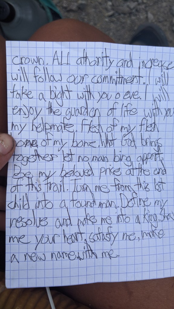I asked if he wanted me to read it now or later. “Later” he said, and I was so relieved that I didn’t have to read it then and there in front of him. He asked where I planned on camping for the evening, and I threw out a mile marker far ahead of where we were. “Well, we better get going then.” he said, taking off. I followed behind for a bit before ducking behind some bushed next to a stream to get water. I waited until he was far enough away and opened the note. Reading it was bone chilling.