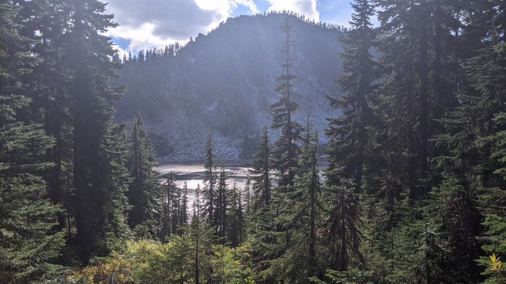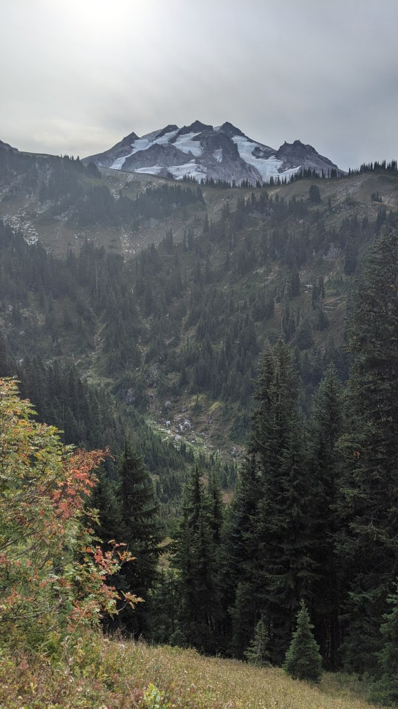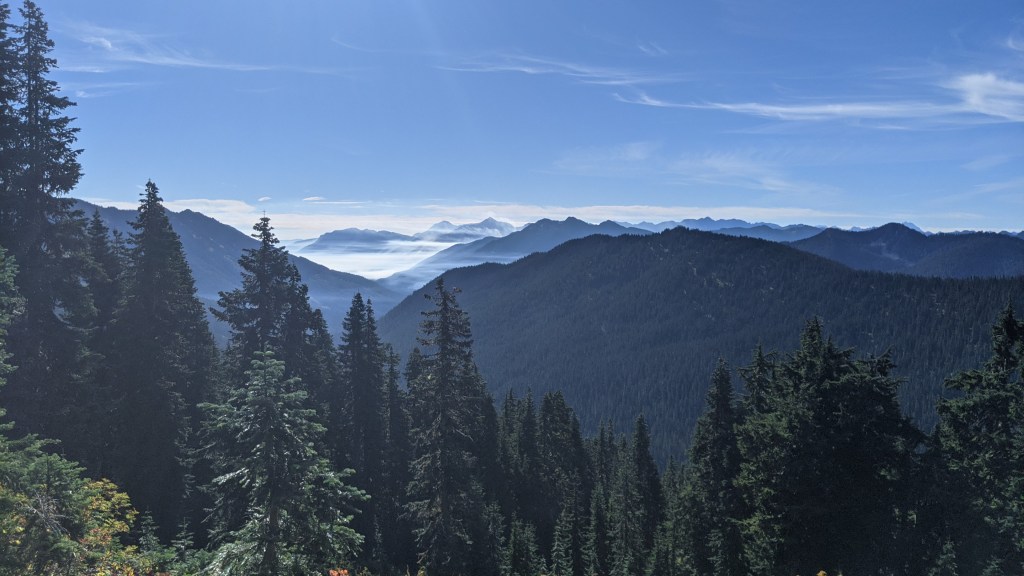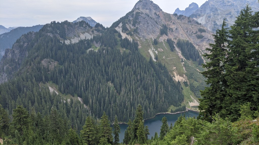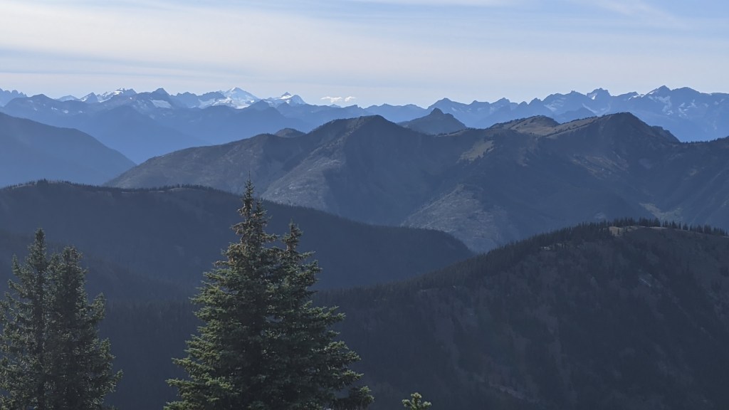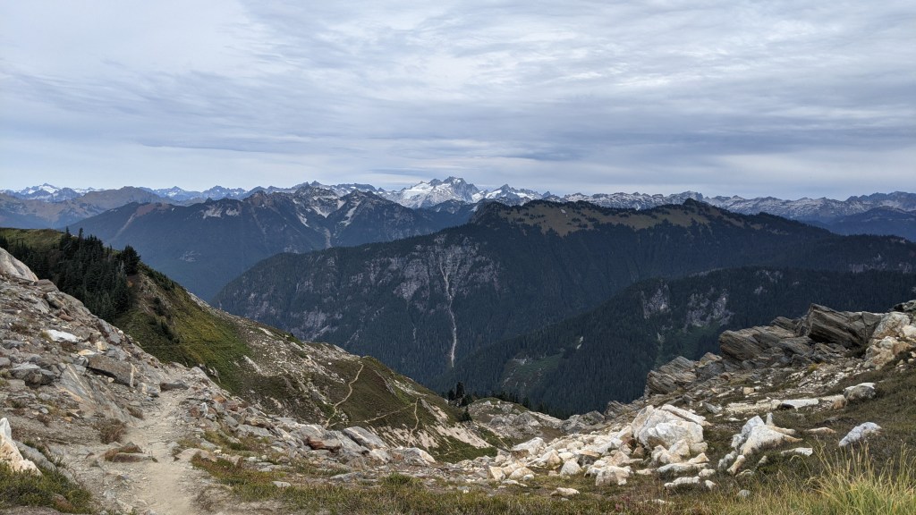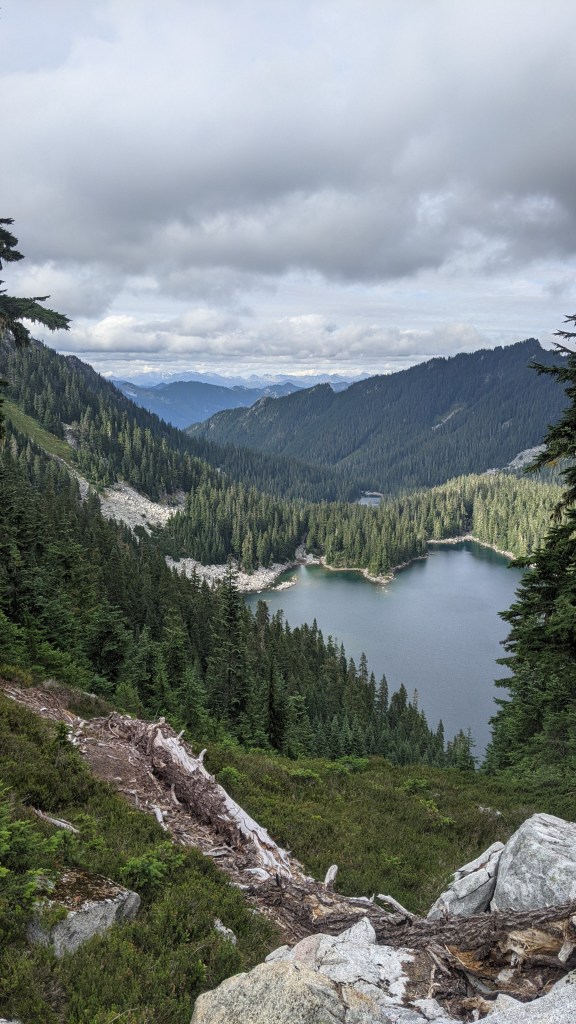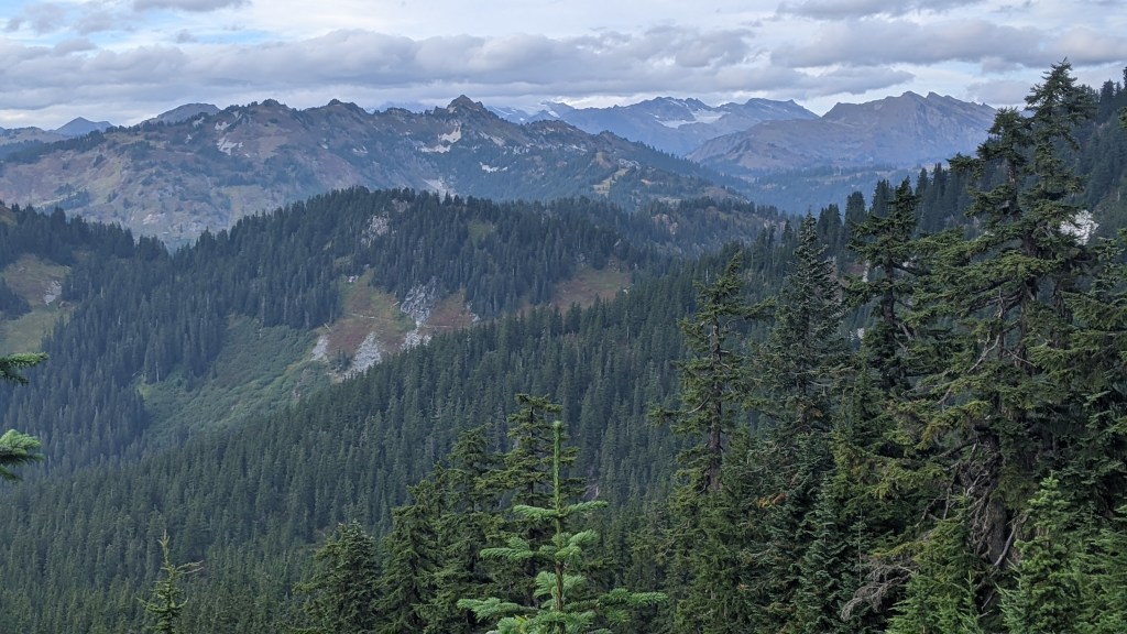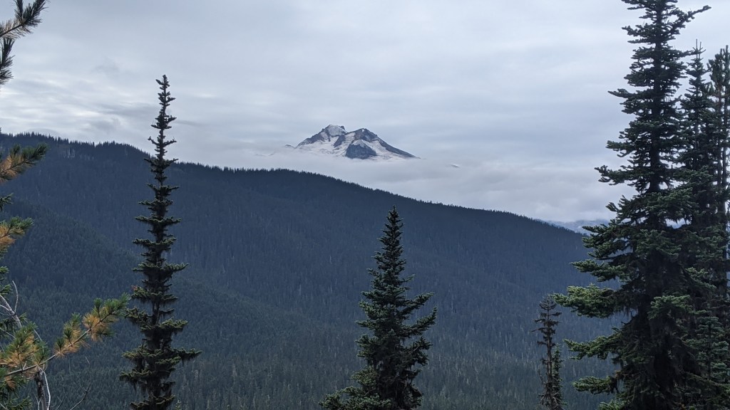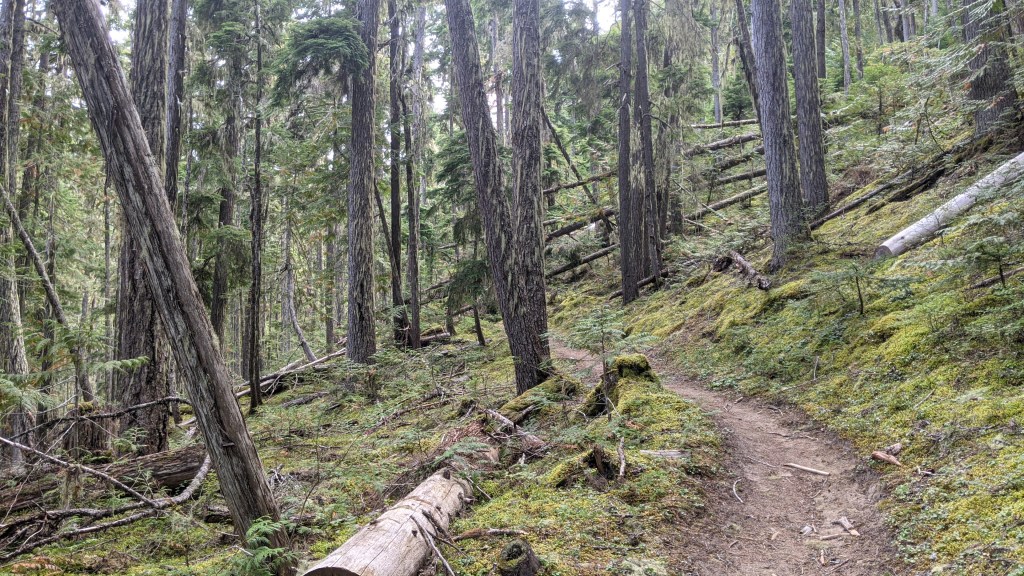 The views were beautiful, but the trail was challenging. Fallen trees everywhere meant that I was constantly climbing over, then under, then over logs on trail. Sometimes if the trees were particularly large I was forced to go around, trying to find purchase on loose soil on the slope of a mountain.