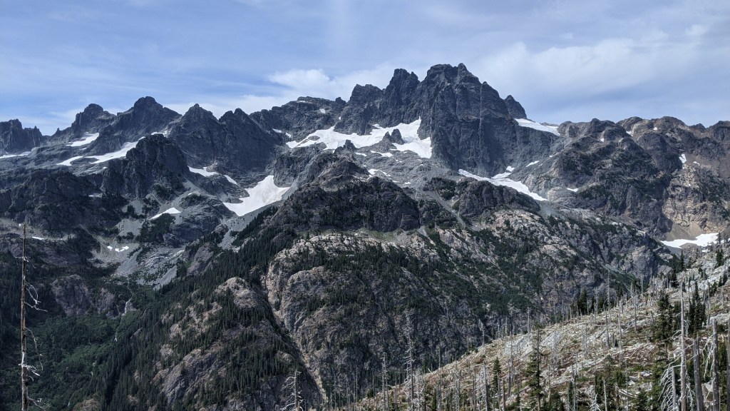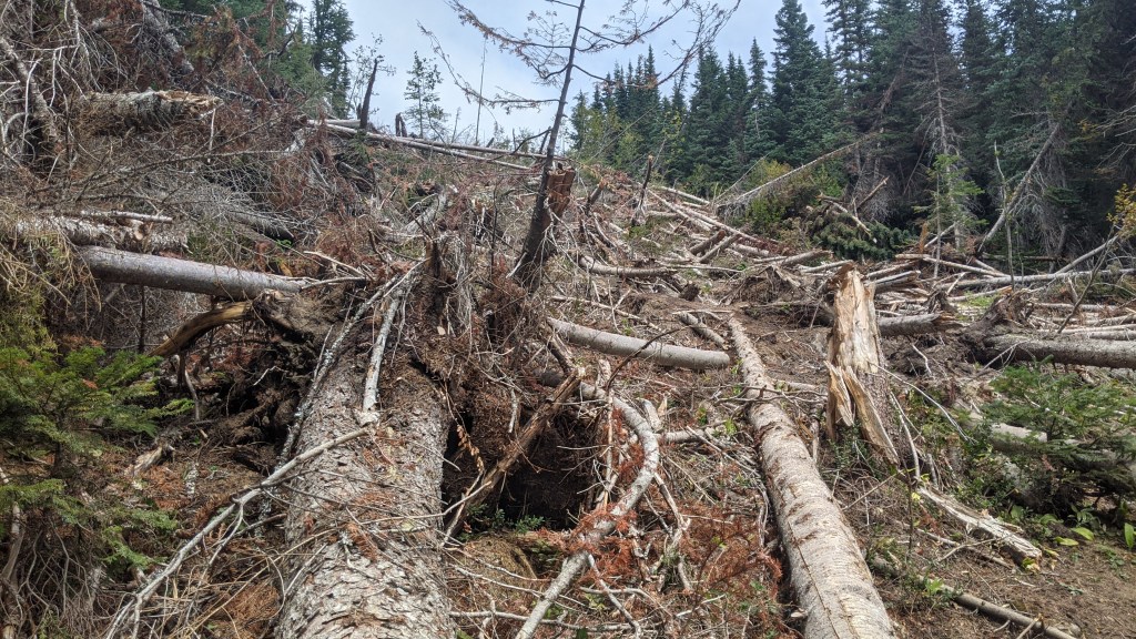 The next morning we had several huge climbs to get through. The trail maintenance here started to suffer. Short summers, severe weather, and the remote location all make this a difficult section of trail to maintain. I found myself crawling over many blow downs and inching across eroded sections of trail.