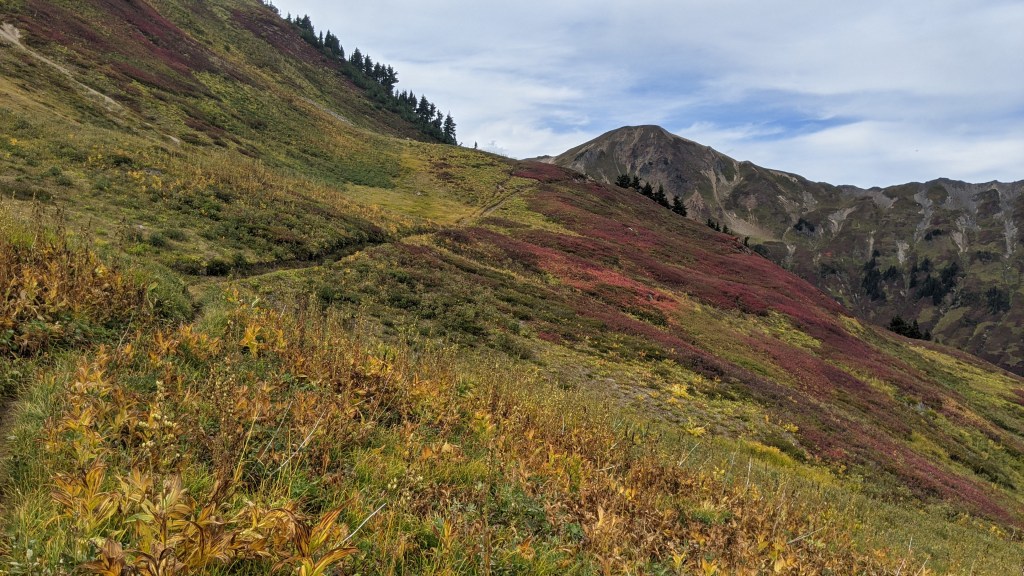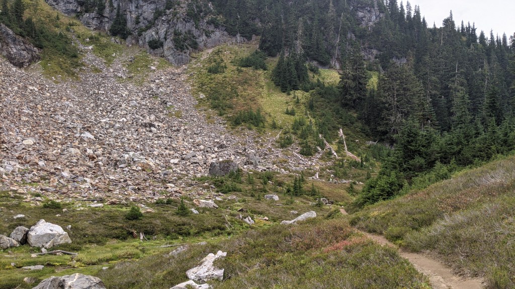 Somewhere along one if the steep ups and downs, Half Moon, who was behind me, managed to get off trail and went straight down a field of scree. He ended up in front of me, so it must have been faster, but I didn’t envy his shortcut. The trail was brutal enough as it was.