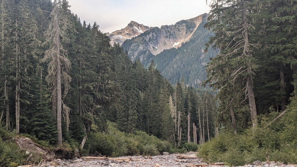 The trail goes through a few burn zones in the area. We passed many beautiful campsites by a river that were unfortunately full of weekend hikers. We kept going but soon found ourselves in an avalanche zone with a plethora of downed trees. It made hiking slower, and by the time we finally found a suitable campsite it was near dark. Half Moon and I decided to make the best of what might have been one of our last clear nights and cowboy camped.