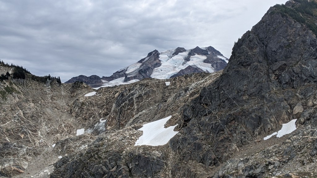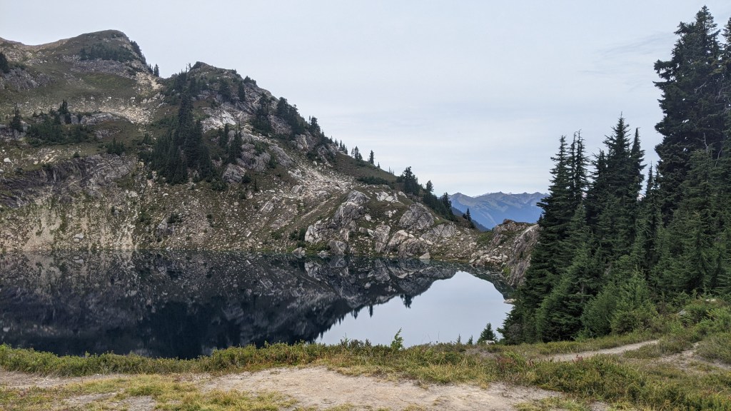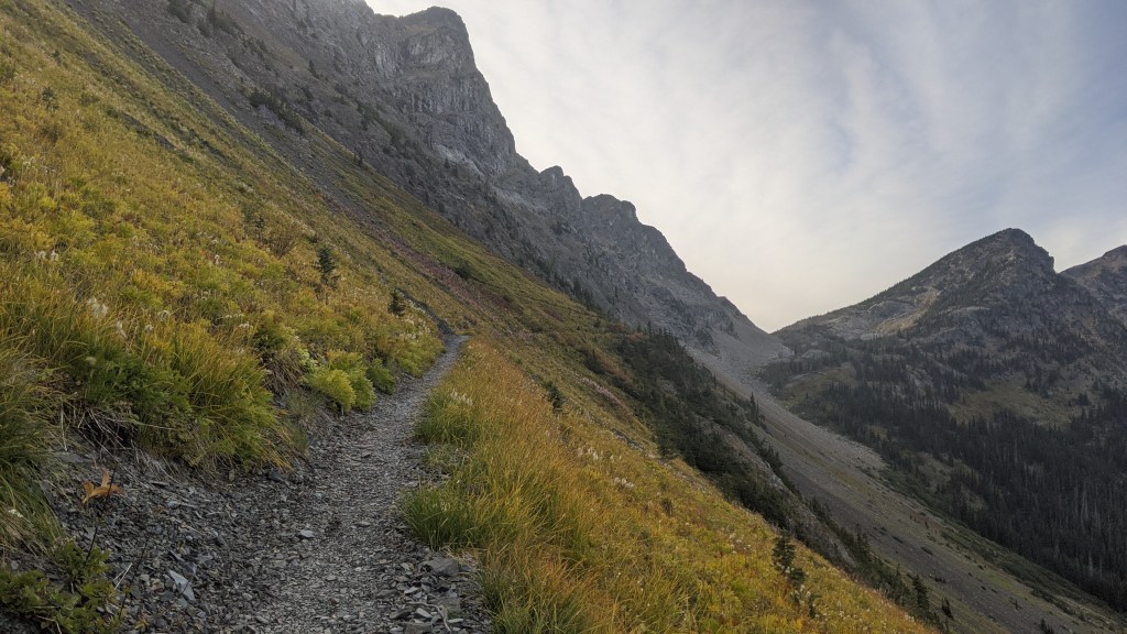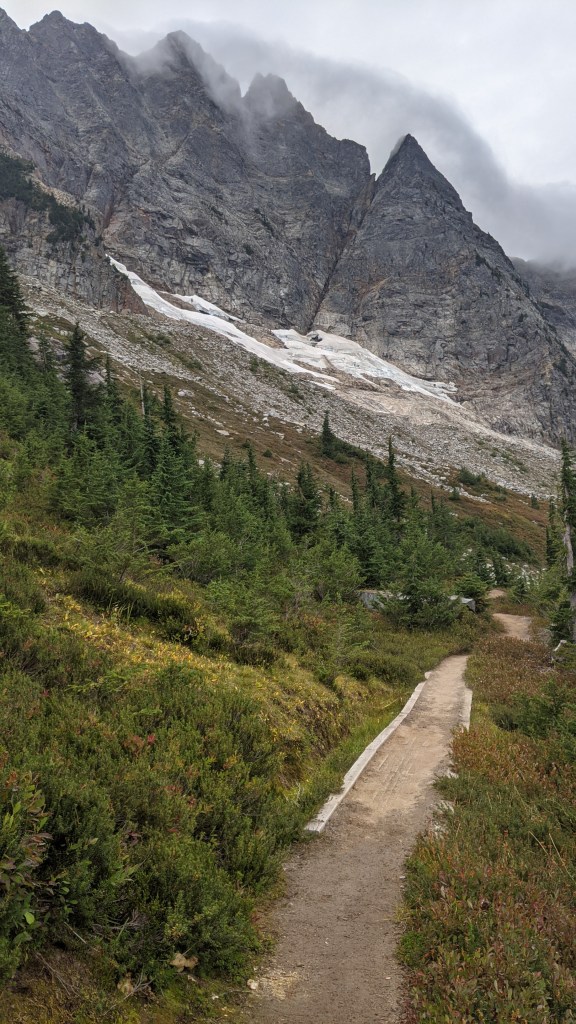 The shores of the lake were, again, packed with backpackers out for the long weekend, so I continued on. The trail climbs to yet another pass before descending into a valley and then heading straight up the walls of the valley again. The clouds moved in and I worried it might start raining again.