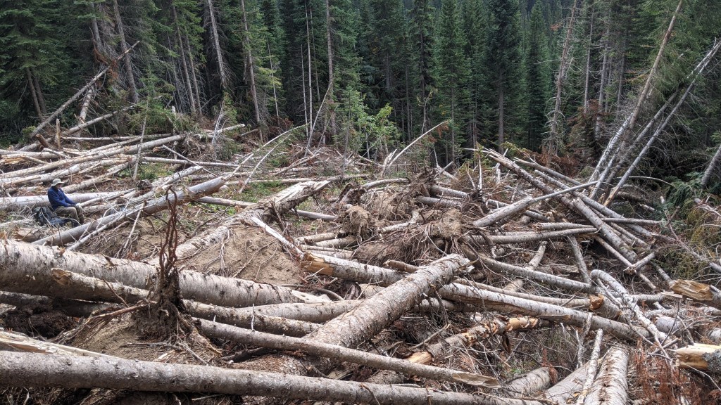 The next day started with a 6 mile detour. The original PCT bridge had washed out, forcing the trail to detour six miles to the next one. Some hikers try to ford the river in the original location, but after seeing Hopscotch break her ankle the day before I didn’t want to take any chances. About halfway up a large climb the trail ended abruptly at a literal wall of fallen trees. A recent avalanche had caused an entire stretch of the forest to blow over. I was fortunate that enough hikers had gone before me to indicate a path through. Still, getting over and to the other side felt a bit like climbing a jungle gym. I couldn’t really fault the forest service for this one. Clearing this mess would be a serious undertaking, and I’m not even sure where you would start.