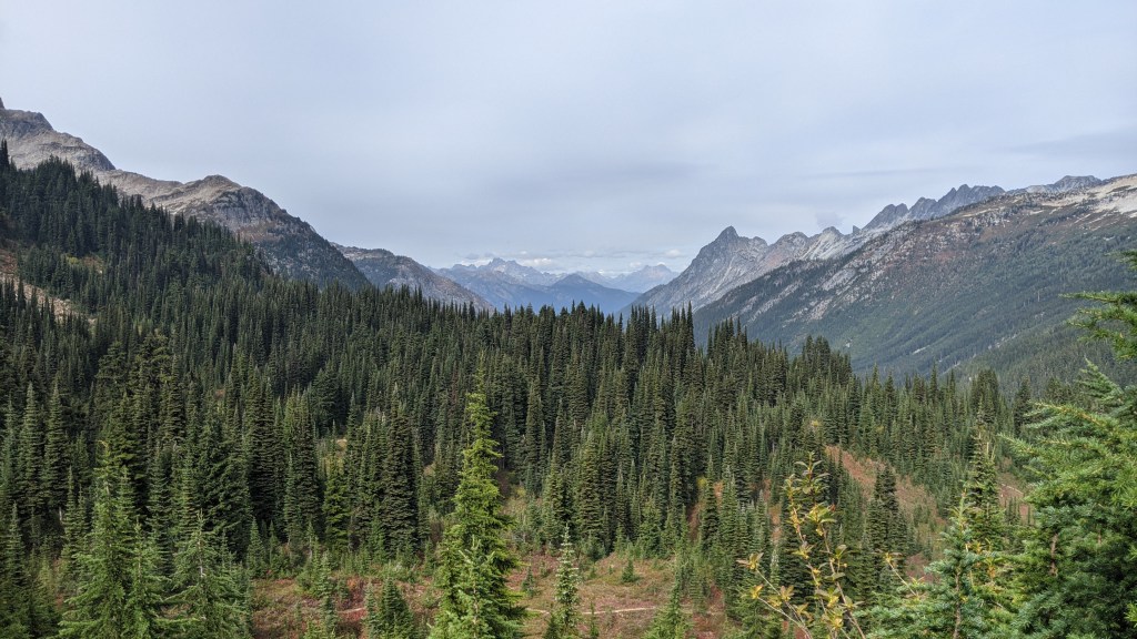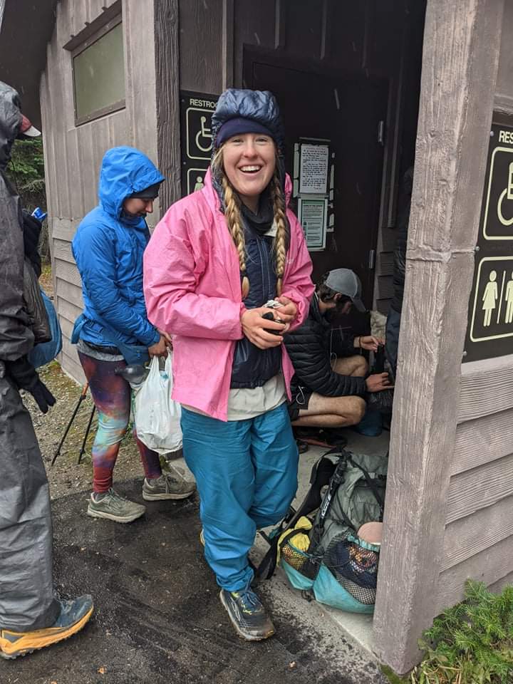I woke up early and got an early start at first light. It was warmer that the previous few mornings and I was optimistic. However, as the morning went on in only got colder and windier. The rain started around 8 and didn’t stop the rest of the day. I passed more hikers than I’d anticipated coming in. I didn’t think so many people would head in into the storm, but no one wanted to sit around and have to wait. Cheering on the brave hikers heading in gave me energy, and I finished the last seven miles back to Hart’s Pass in only a little over two hours. I got to Hart’s Pass early, so I changed into all of my dry layers and huddled under the covered overhang of the pit toilet for warmth once I stopped moving.