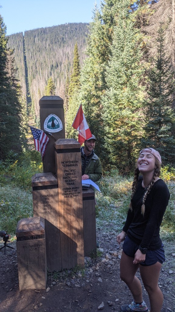The trail is in forest with no views leading up to the terminus, but about 100 yards before I caught a glimpse of a long strip of treeless space along a mountain. That was the border, we were right there! We started shouting when we saw the clearing and the monument ahead of us. I’d actually done it. I’d made it to Canada!